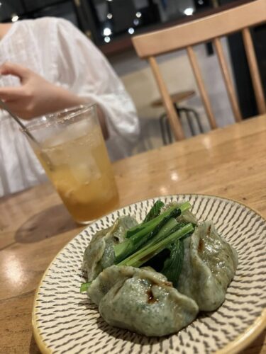 ⚪︎モロヘイヤを皮に練り込んだえび入り水餃子