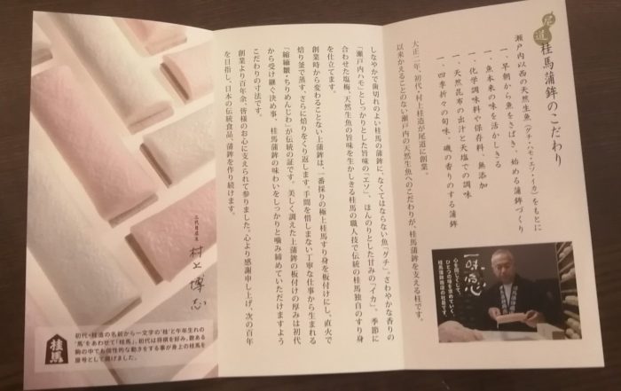 桂馬蒲鉾の百十年史を語る村上さんからは創業者である祖父、二代目社長の父、三代目社長の夫、四代目を継ぐことになる娘さん夫婦や若い社員への敬意と愛情が感じられ、我がまち尾道を代表する味覚「桂馬のかまぼこ」の変わらぬ味わいに繋がっていると感じました。