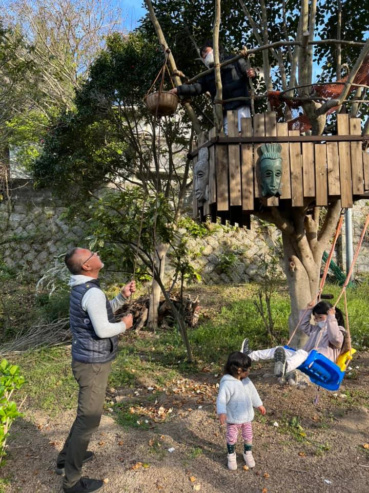 子供たちは、ブランコしたり、滑車でカゴに小荷物を入れてあげたり下ろしたり、大喜びです。