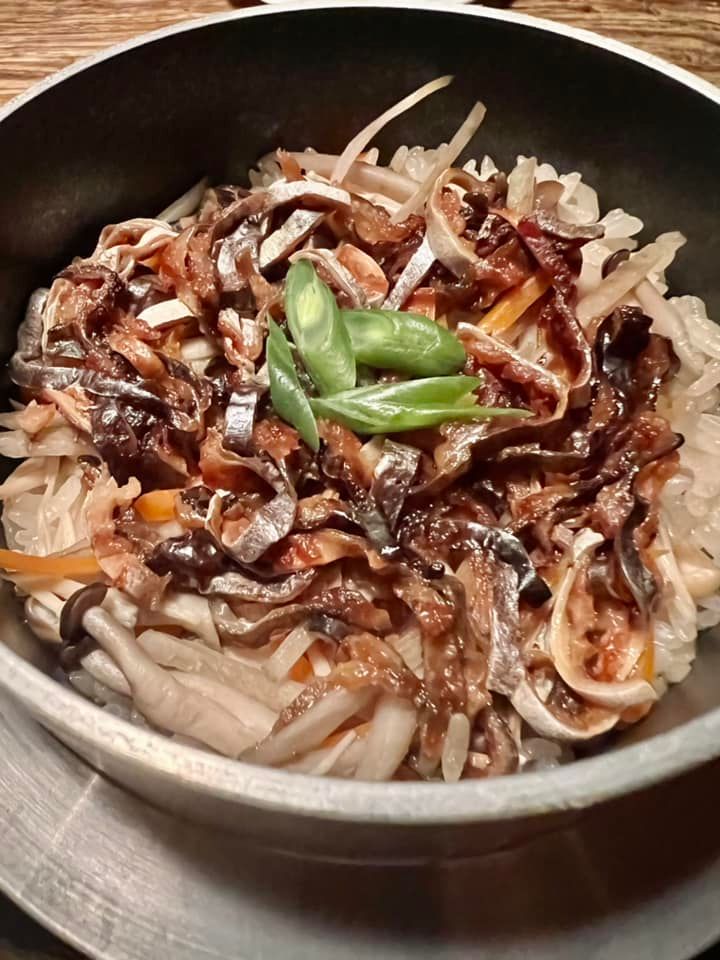 細切りの人参、牛蒡、しめじと共に炊き込みお醤油の香ばしい香りと鱧の旨味がとても美味しい釜飯です。