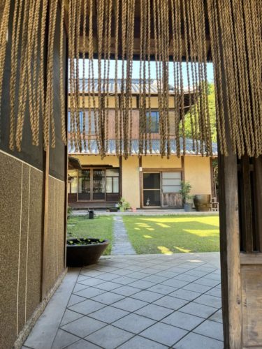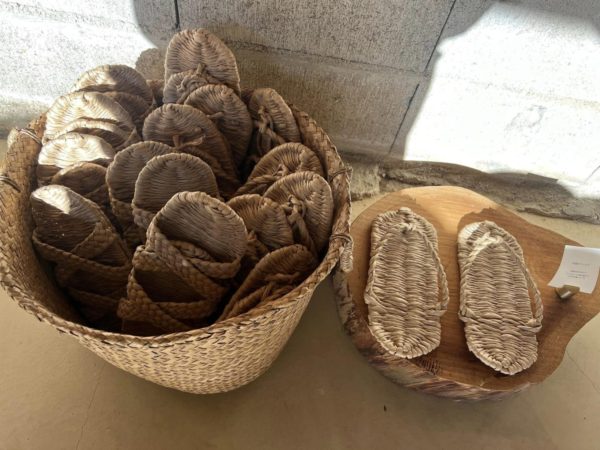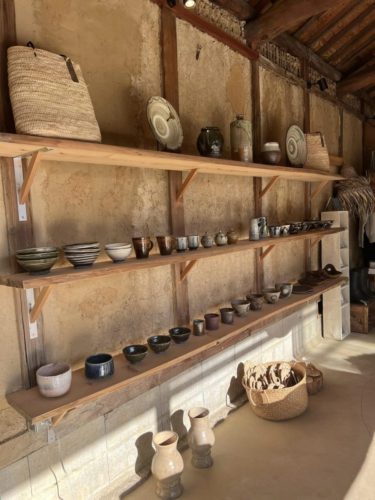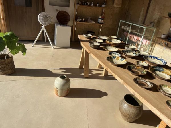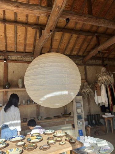 オーナーの久美ちゃんお見立ての陶器、「島原そだち」の麺はじめこだわりの食品、ウェア、和紙の草履などが、古民家の納屋を改装した素敵な空間に披露されてます。