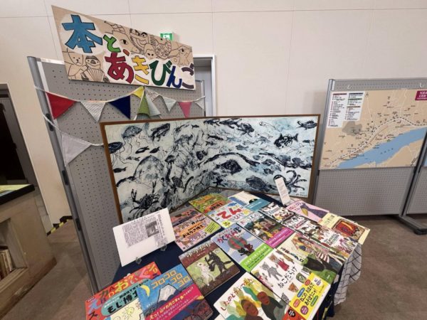 桂馬100周年の日本手ぬぐいのお魚の絵柄を描いていただきました、絵本作家「あきびんご」先生のコーナーがあります。