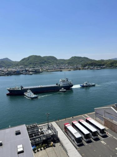 そして、尾道水道風景は、向島ドックに入る修理船を3隻のタグボートで誘導する光景に出会いました。