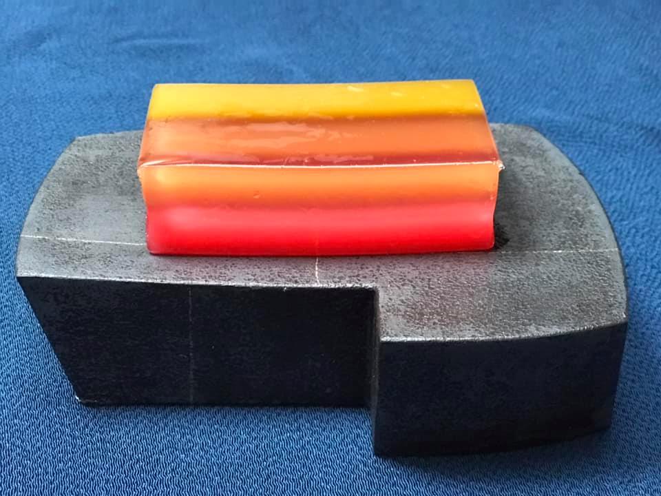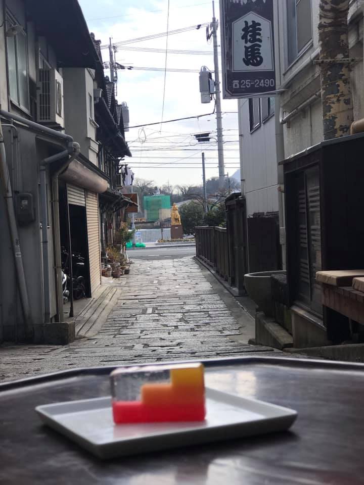 白の琥珀羹に、紅、橙、黄のねり羊羹が一段づつ配されてます。