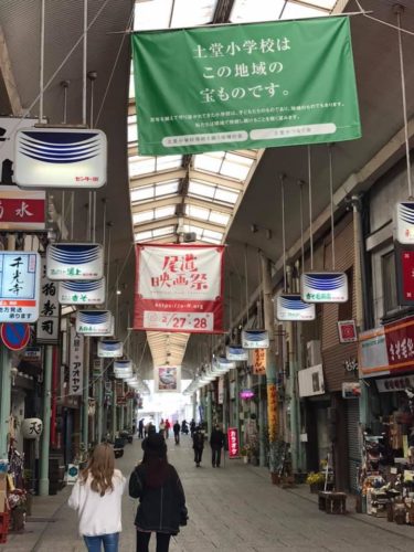 3種の横断幕がアーケードの中で尾道の意思を表してます。