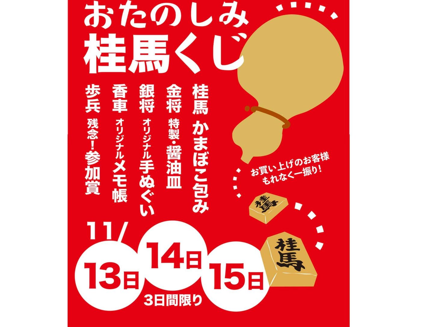 11月13日、14日、15日はかまぼこの日にちなんでお楽しみ〝桂馬くじ〟をご用意してお待ちしております🎊