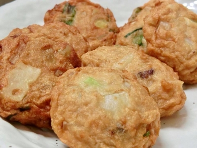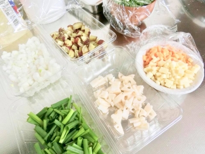 尾道産のレンコン、わけぎ、玉ねぎ、さつまいも。チーズなど、お好みの具材を合わせて、お好きな形にし、揚げていただきました。