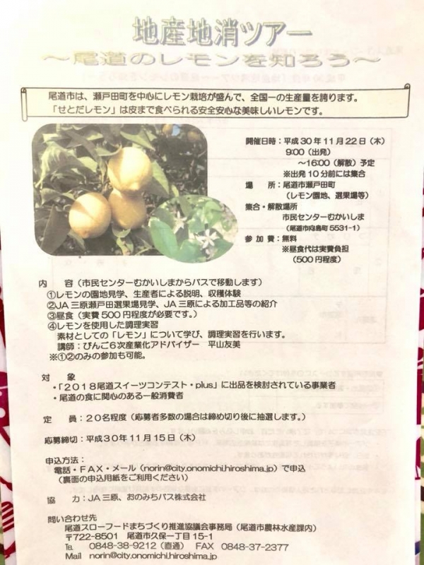 次回の、地産地消イベントは、11月22日 地産地消ツアー 〜尾道のレモンを知ろう〜 です。