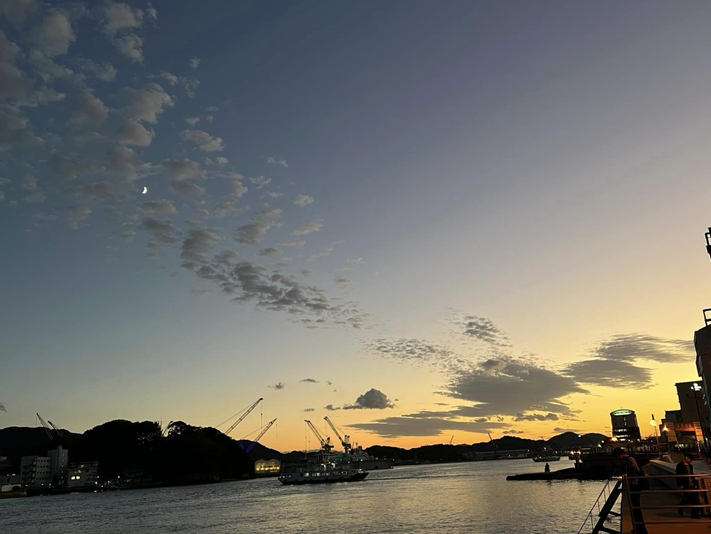 夕焼けの空模様に かわいい三日月のお月さまを見つけました。