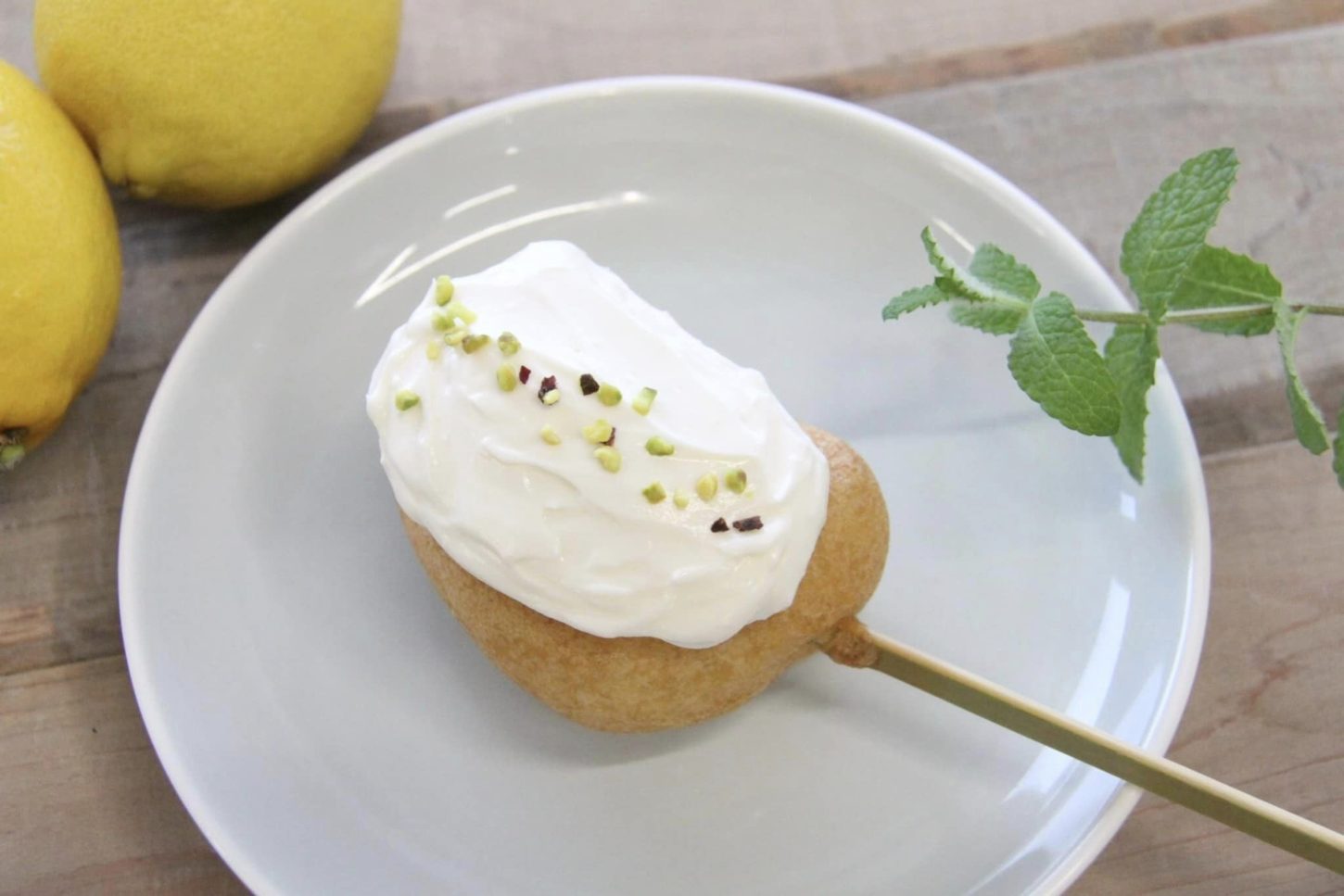尾道産レモンとマスカルポーネチーズを合わせたソースをかけてピスタチオをトッピングしたものです。