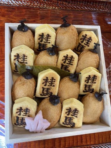 お祝いの気持ちを込めて桂馬蒲鉾の、「柿天」と「駒焼」で将棋をイメージしてこんな詰め方をしてみました。