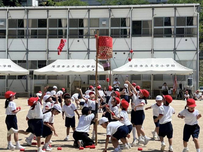 今日の土堂小学校の運動会テーマは「笑顔・全力・土堂っ子」