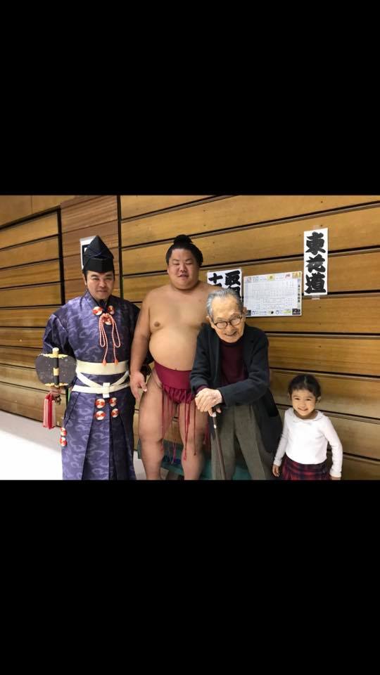 大相撲三原場所で行司の木村寿之介さんと大栄翔関と写真を撮らせていただいた父は大喜びです!