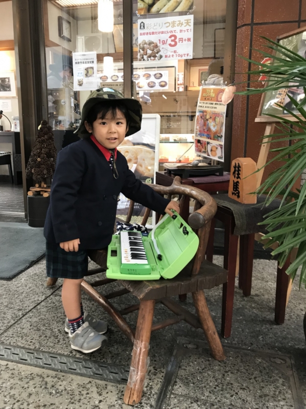 ↓お休みの日なのに、制服のブレザーとズボンを着て、ネクタイを付け、商店街で鍵盤ハーモニカの演奏をする息子(笑) 私に似ず、ピアノが好きです。