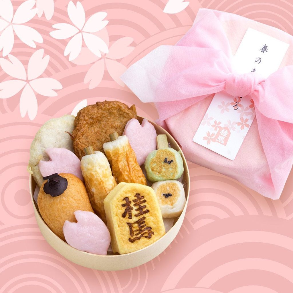 桂馬蒲鉾商店では桜の花びら蒲鉾や桜もち天などをお詰めした
