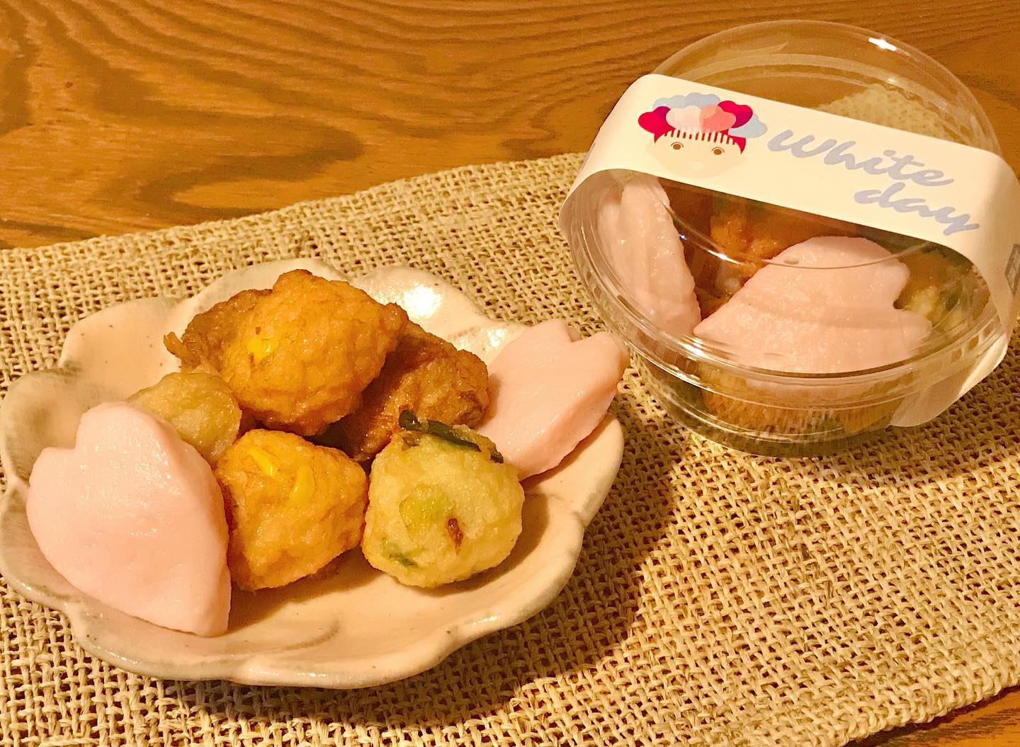 ひと口サイズのおつまみ天と桜の花びらかまぼこをお詰めしました☺️🌸