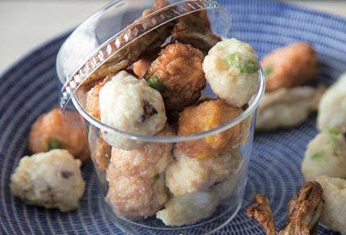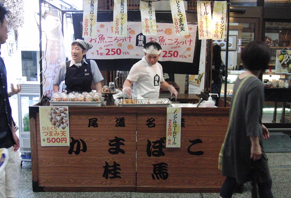 桂馬屋台ではオニオンとスイートコーンのおさかなコロッケや煮たまご天、おつまみ天など
