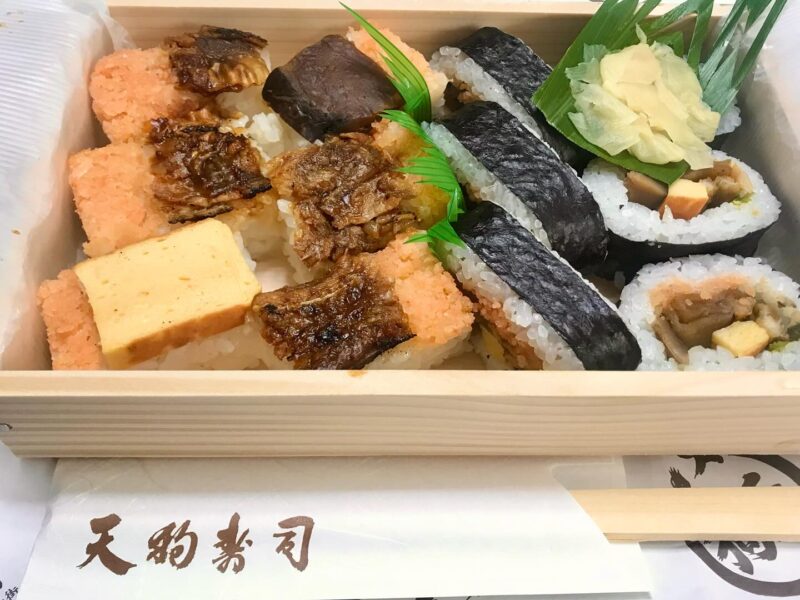 箱寿司は炭火で香ばしく焼き上げた瀬戸内の穴子や小海老のおぼろなどが乗った押し寿司です。
